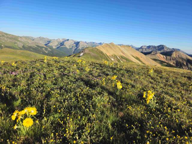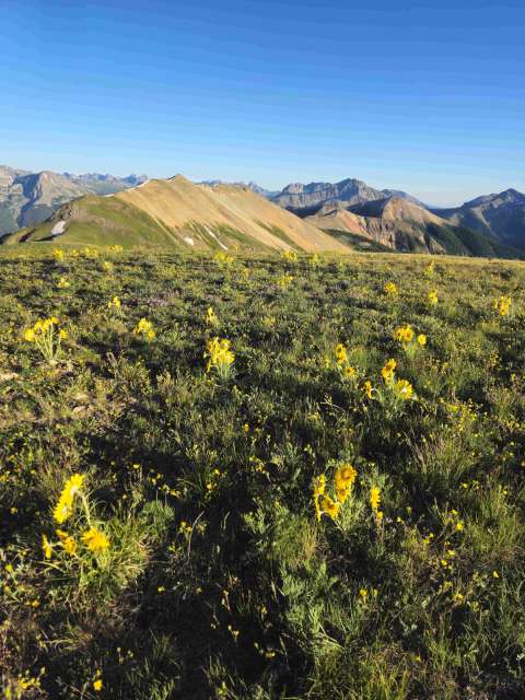 The conditions were awesome. The wild sunflowers were out. The entire hike was above treeline in the alpine which is my favorite. I frolicked down from US Basin and met Jo at the saddle below Ohio where an old miners hut was located. Together we climbed the rest of the way to the summit as the sun was going down.
